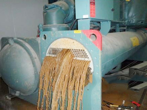5、排放废液,拆卸热交换器的端盖进行热交换器通炮清洗,这样可以保证百分百把冷凝器清洗干净